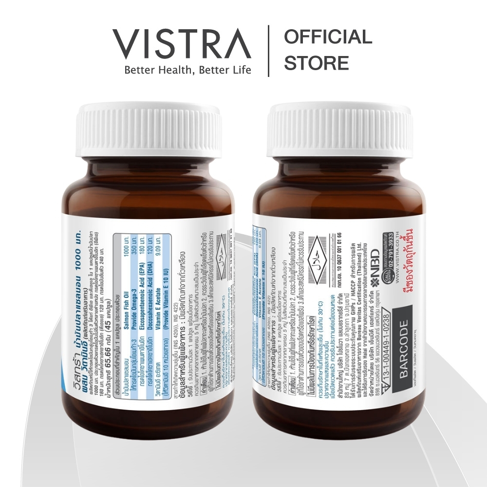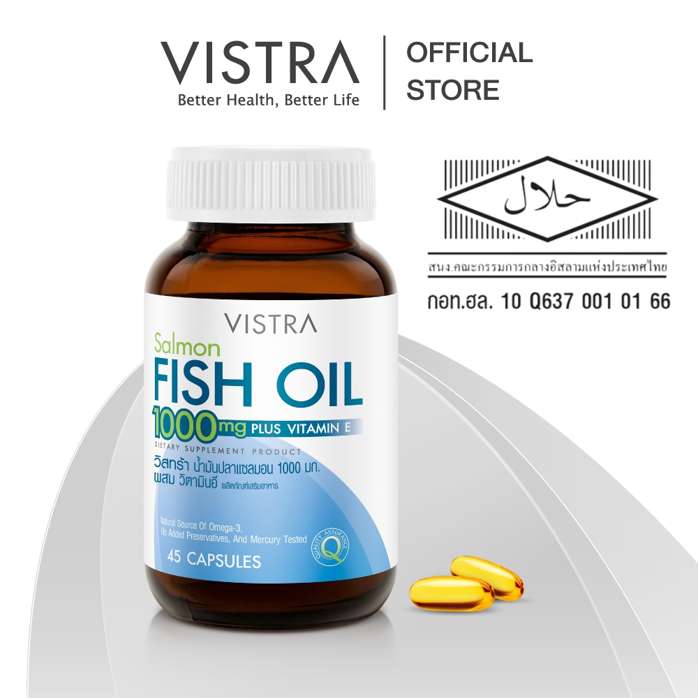 VISTRA Salmon Fish Oil 1000 mg Plus Vitamin E วิสทร้า น้ำมันปลาแซลมอน 1000 มก. ผสม วิตามินอี (ผลิตภัณฑ์เสริมอาหาร) ส่วนประกอบ ส่วนประกอบที่สำคัญใน 1 เม็ด ประกอบด้วย – น้ำมันปลาแซลมอน 1000 มก. ให้กรดไขมันกลุ่มโอเมก้า-3 350 มก. – กรดไอโคซาเพนตาอิโนอิก Eicosapentaenoic Acid (EPA) 180 มก.