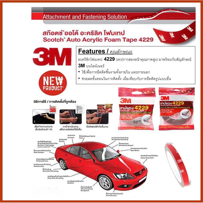 ⚡ส่งด่วน⚡ กาวสองหน้า 3M แท้ 100% ยาว 10 เมตร กว้าง12มม หนา0.8มม กาว3m ติดรถยนต์ กาว 2 หน้า 3M เทปกาว 3M 4229 เทปกาวสองหน้า 3M สามเอ็ม 3M 4229 เทปกาว 2 หน้าชนิดบาง (โฟม) สำหรับงานตกแต่งรถยนต์ หน้ากว้าง 12 มม. ยาว 10ม. หนา 0.8 มม. แรงยึดติดสูง ทนต่อแรงดึงอย่างดีเยี่ยม มีความยืดหยุ่นทำให้เทปไม่หลุด